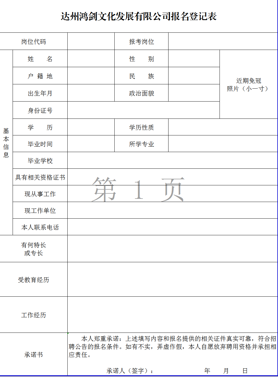 4.报名需提供材料:《达州鸿剑文化发展有限公司报名登记表》纸质版;学业毕业证、有效居民身份证、资格证书等复印件(1份);并交近期同底免冠1寸照片3张(含电子版);报名时认真填写联系方式(电话号码),须确保所留电话号码畅通。