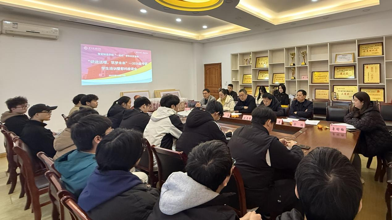 在2025年全国硕士研究生招生考试进入最后倒计时之际,为鼓舞考研学子士气、缓解备考压力、传递学院关怀,12月15日下午,智能制造学院在莲湖校区博文楼404会议室成功举办“研途送暖,筑梦未来”2026届考研学生慰问座谈会。学院党委书记李涛、副院长(主持工作)刘笃晋、党委副书记吴晓燕、教研室主任户永清、曾强、涂鸿,教科办主任唐瑜梅、教师代表、辅导员代表及2026届考研学生代表共同参加。会议由吴晓燕主持。