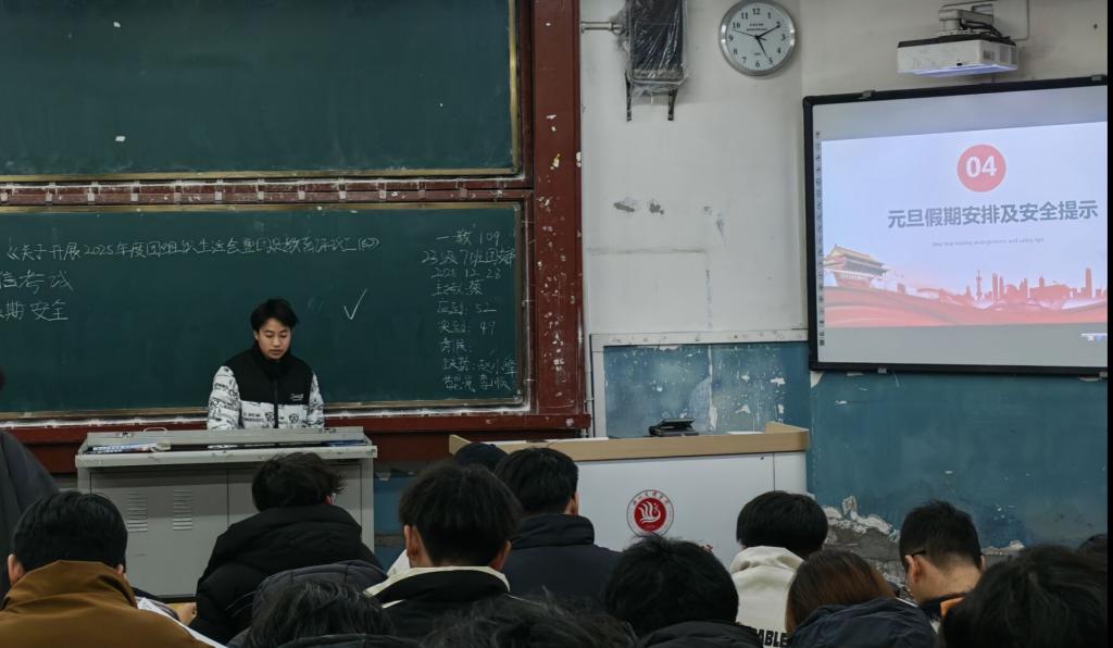 各团支部及时传达2026年元旦假期放假安排,同时着重强调假期安全注意事项,进一步强化全体同学的安全防范意识。具体提醒同学们重视相关安全内容:交通安全,如不乘坐无资质车辆、严格遵守交通规则;消防安全,如离校前务必断电断火、不违规使用电器;财产安全,如提高警惕防范电信诈骗、妥善保管个人贵重物品;人身安全,如不前往危险区域、自觉远离不良场所;健康安全,如注重饮食卫生、做好个人健康防护等,切实保障假期安全。