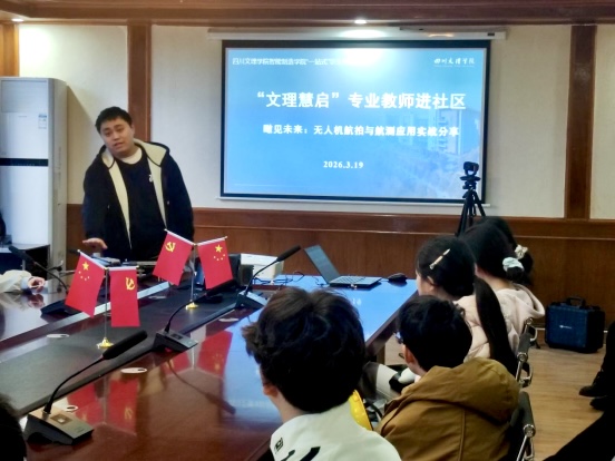 活动现场,专业教师李洲官、石沁雨、彭鸿铭分别围绕无人机相关知识展开系统讲解,从航空器基础分类切入,清晰阐释了轻于空气、重于空气两类航空器的飞行原理,重点讲解了直升机与多旋翼无人机的结构差异和飞行控制逻辑,同时介绍了飞机转向、姿态调整的核心原理。结合航测无人机的行业应用,教师详细讲解了其在摄影创作、科研遥感、社会建筑、电力能源等领域的实践价值,对比卫星遥感分析了无人机航测数据精度高、获取灵活的优势,让学生对无人机航测的应用场景有了全面认知。